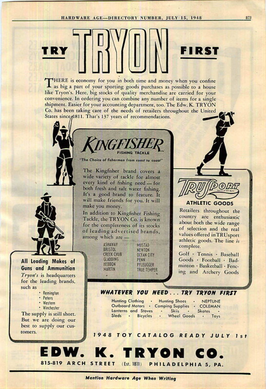 TruSport was a brand name of merchandise distributed by Edw. K Tryon of Philadelphia. Knives, tools and saws from the 1800's were stamped with the truSport brand. Eventually TruSport was used for athletic goods. Below are ads for different TruSport athletic products.