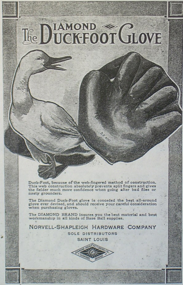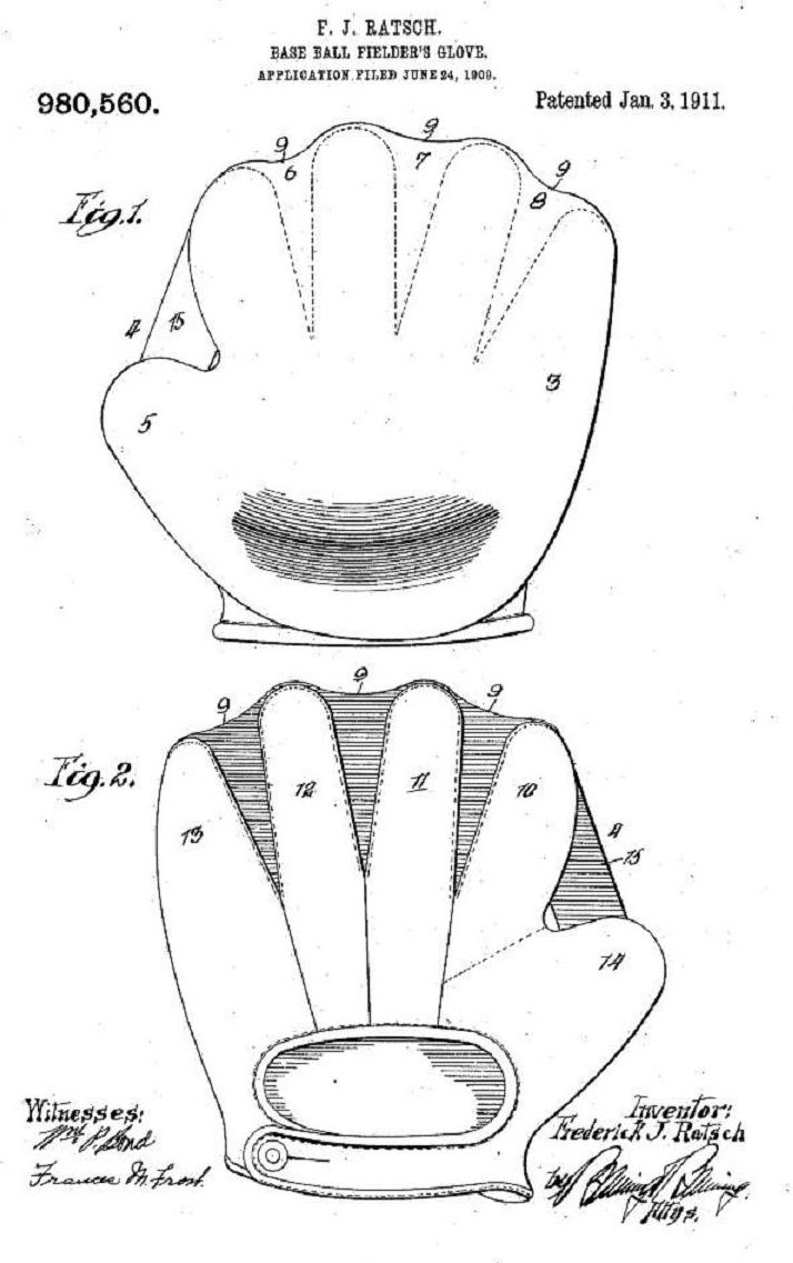 The main reference cited is the Rawlings 1911 patent for a "Duck Web" glove. Just scanning both patent illustrations, one can see the similarities.1911 Rawlings "Sure Catch" model below