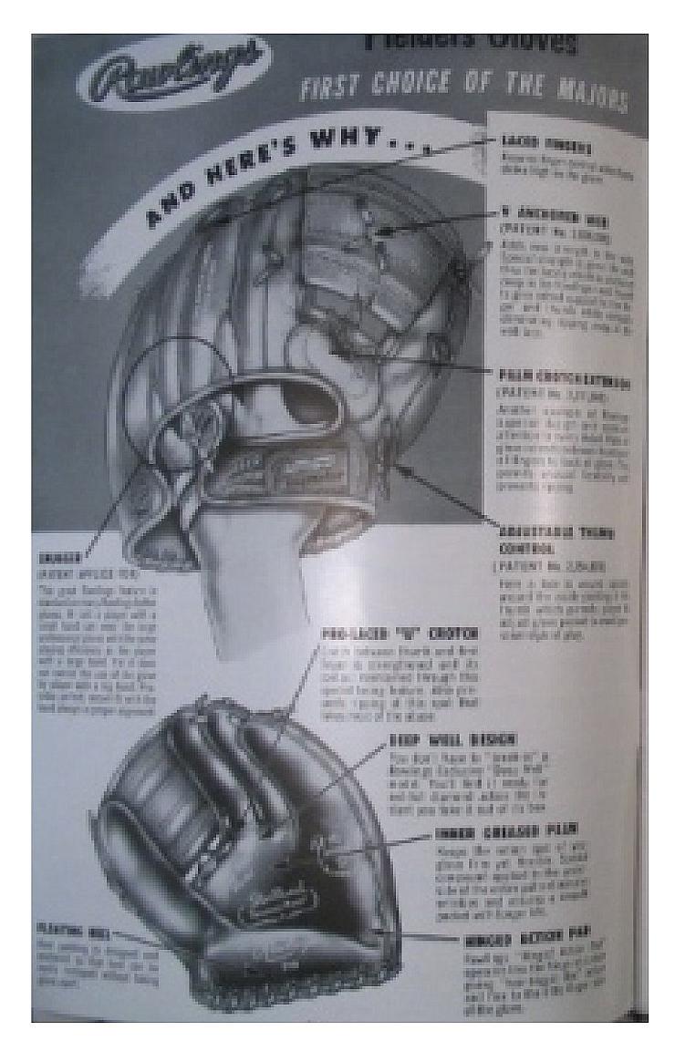 The 1954 Rawlings catalog below shows the wrist "Snugger" and thumb loop only, leaving out the pinky loop