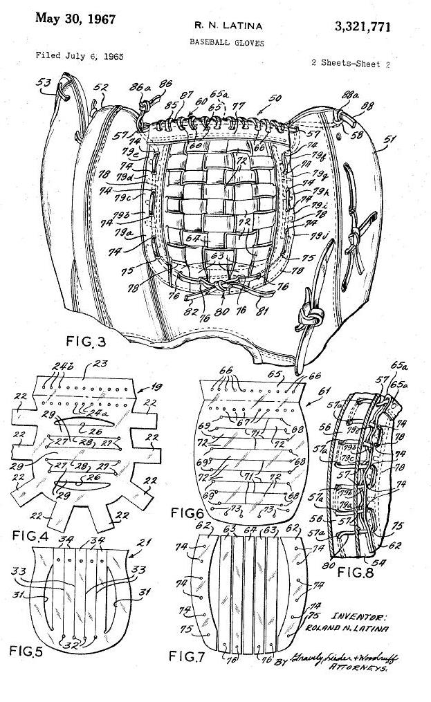 As you can see, webbing of the gloves and mitts was an important consideration for the Latinas. Some of the Latina web patents were designed to be used on both gloves and mitts as this 1962 patent states