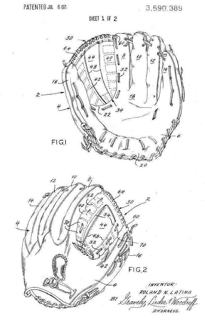 Two 1948 patents issued at the same time dealt with the web attachment and wrist strap of catchers mitts. Previous to the first patent below, the perimeter lacing of catchers mitts extended into the crotch between the thumb and body of the mitt. The crowding of lacing and grommets in this area decreased flexibility and increased the wear and tear of both grommets and lacing. The Latina patent used overlapping leather tabs sewn into the crotch to eliminate the perimeter lacing in that area incresing flexibility and strengthening the metal grommets used to attach the web