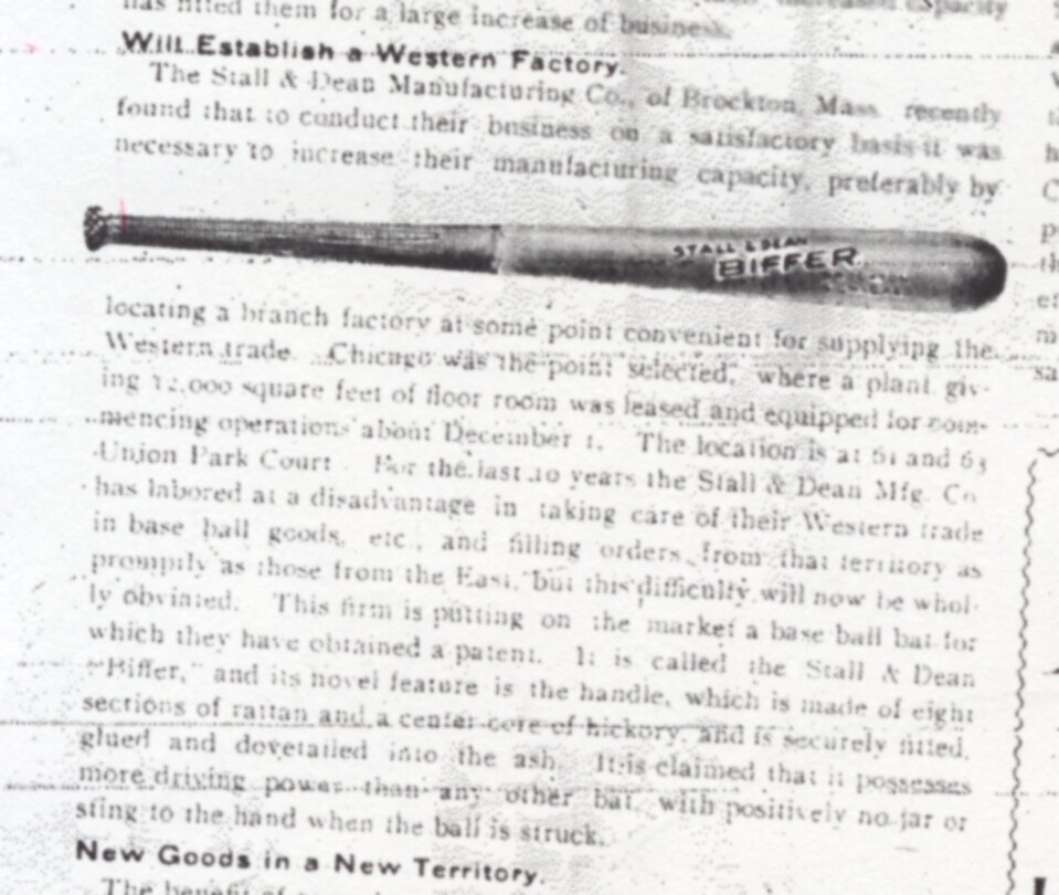 "The Stall & Dean Manufacturing Co. of Brockton, Mass. recently found that to conduct their business on a satisfactory basis it was necessary to increase their manufacturing capacity, preferably by locating a branch factory at some point convenient for supplying the Western trade. Chicago was the point selected, where a plant giving 12,000 square feet of floor room was leased and equipped for a commencing operations about December 1st. The location is at 61 and 63 Union Park Court. For the last 10 years the Stall & Dean Mfg Co. has labored at a disadvantage in taking care of their Western trade in base ball goods, etc. and filling orders from that territory as promptly as those from the East, but this difficulty will now be wholly obviated. This firm is putting on the market a base ball bat for which they have obtained a patent. It is called the Stall & Dean Biffer and it's novel feature is the handle, which is made of eight sections of rattan and a center core of hickory, and is securely fitted, glued and dovetailed into the ash. It is claimed that it possesses more driving power than any other bat with positively no jar or sting to the hand when the ball is struck."