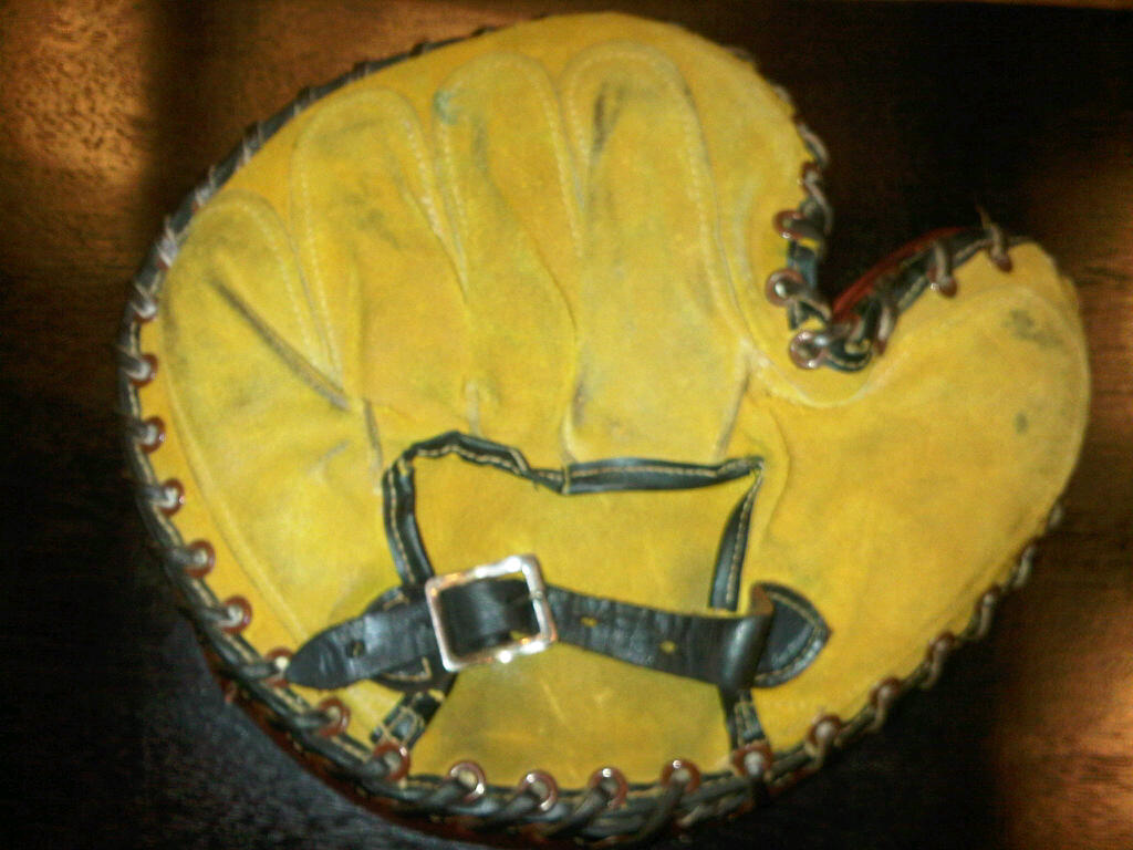 Hi i am new to the forum and was wondering if i can get some help on dating a glove? it is a 2 tone catchers mitt on the face is burgundy leather and the reverse is a brown suede there is no lace between the thumb and and the rest of the glove. I was wondering on an age, also no visible makers label.
