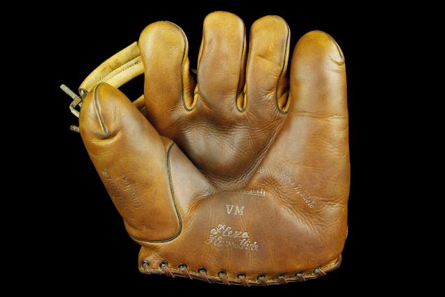 The cross web "Snare" design of the 1930's mitt above was later modified and patented for both base mitts and fielders gloves in 1949.