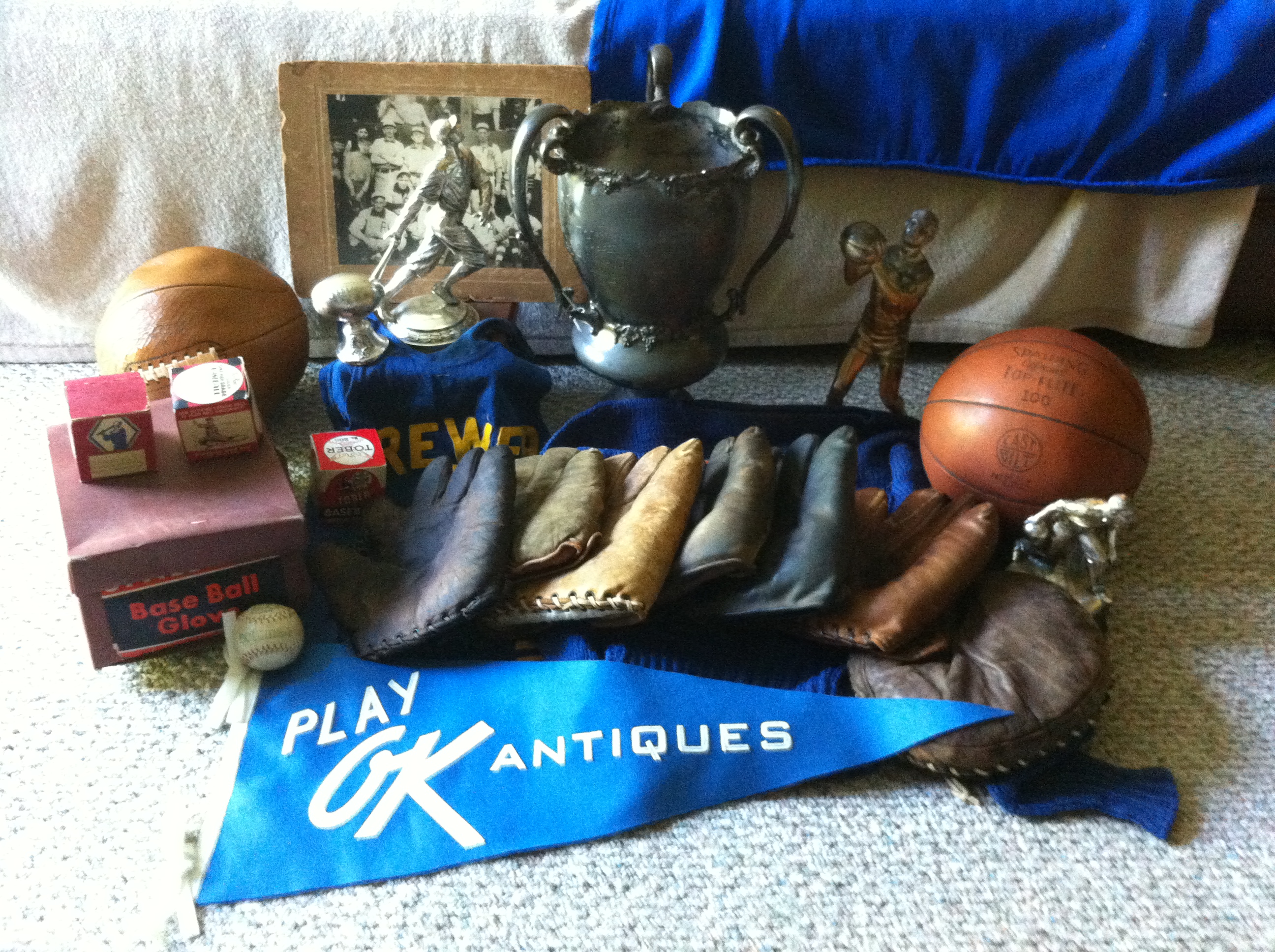 What a quick but super tiring week at the Brimfield Antiques Market! The fun started Monday night when I hosted three esteemed collector friends at my house - William Peebles, Dan Hauser and Ed Turner. Dan and Ed are the coauthors of the Antique Sports Uniforms & Equipment book along with John Gennantonio (http://www.booksamillion.com/p/Antique- ... 0764330186). We had fun talking about collecting, chatting over a delicious pile of food until we noticed it was getting late and the early morning wake up call would be upon us soon. Tuesday started off well with a couple of glove purchases and by the end of the morning I had found a couple other items that I was happy with. Tuesday afternoon I have a booth that I sell stuff from - sales were strong and I was happy with the amount of items sold. Got back to the house late Tuesday evening and pretty much went right to sleep to get up early again the next day. Wednesday was chilly to start with and there wasn't much to be found on the fields. Did see something that caught my eye as we were leaving and was able to pick it up Thursday morning. After I got home Wednesday afternoon, John Graham stopped by my house for a bit and I was able to catch up with him and see what he's been up to - he's got some neat projects in the works that I'm sure you'll see sometime in the future. Unfortunately, Thursday's field proved to be pretty barren but I was happy with my finds for the week so I wasn't too bummed out. Didn't have any expectations for Friday but was happy to come across a few nuggets of vintage goodiness. Overall, it was a great week with perfect weather, lots of delicious food and tons of fun. Always a a great time. My favorite item in the picture below is the cool Play OK Antiques pennant William crafted for me - he even used Duke colors!