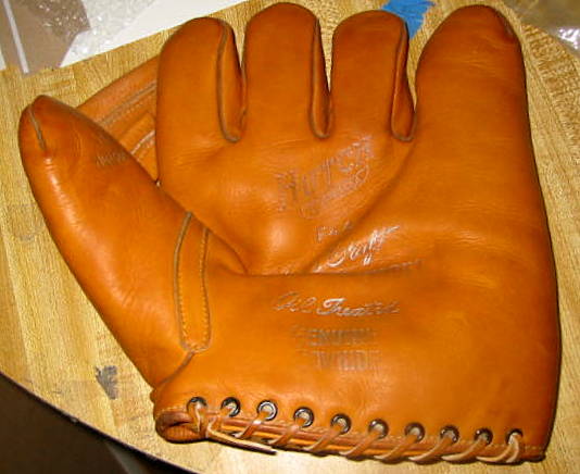This glove pretty much flew under the radar. No detailed description on ebay so it went for $34. It actually is a very nice Treman King brand "Pinky Whitney" model. Someone with a good eye saw the logo in the pocket and cloth patch on the back.