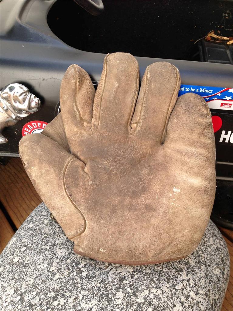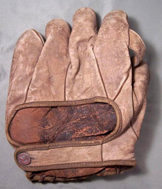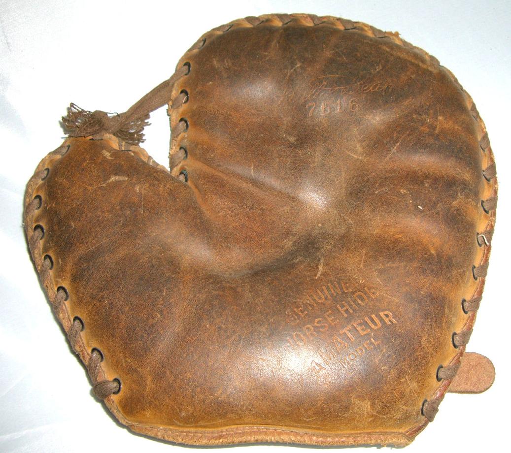 A circa 1930 Stall & Dean "Amateur" model 7616 base mitt sold for $192. A seldom seen back panel design from S&D and overall stellar condition. Nice tan leather on the back and a brown front with all the factory stamps intact. Piping seems to be all leather, just flat sewn and not rolled. Classic S&D wrist strap.