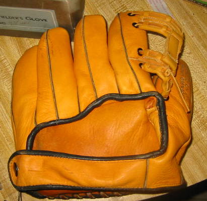 I've always liked the red wine leather on an old timer glove. This Wilson is in very nice shape and has that cool contrasting piping to boot. :D