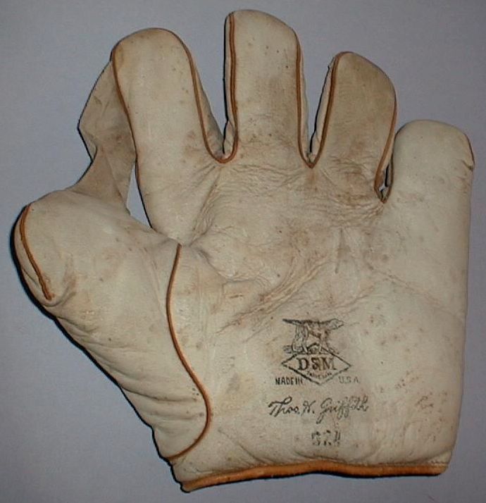 A white leather sewn web D&M "Thomas Griffith" model 24 glove sold for $715. The glove itself is in superb condition. Sometimes D&M would use one of their endorsed model gloves as a "famous player" model and stamp it with the name of a star player of the day. This may be the only known Griffith model.