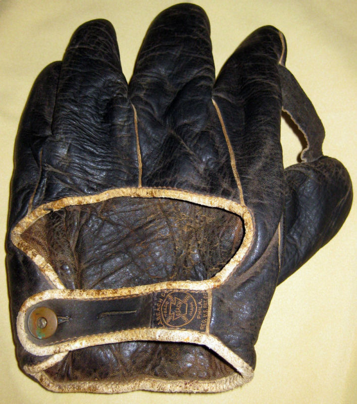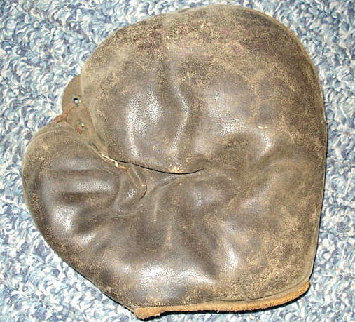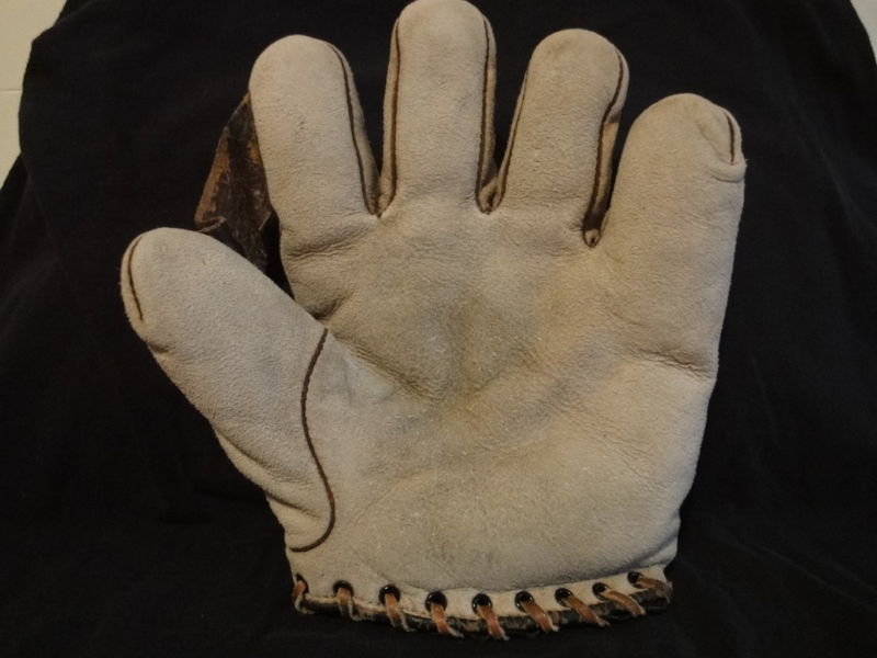 Great job in finding and describing these old gloves. I enjoy your commentary on them. By the way I was the one who ended up buying the cool tri-color (black glove, brown thumb and cream piping and web and liner) old time full sewn web Reach glove with the funky spider/diamond cut web a few weeks ago. It may be a period alteration by someone but I have not ruled out it being a die-cut stamped out web either. Either way, it sits on the top shelf of the glove loft with some other cool funky webs.
