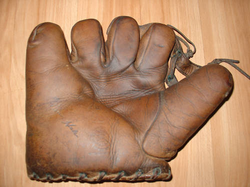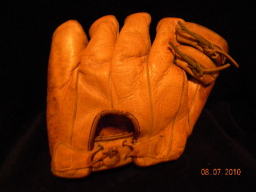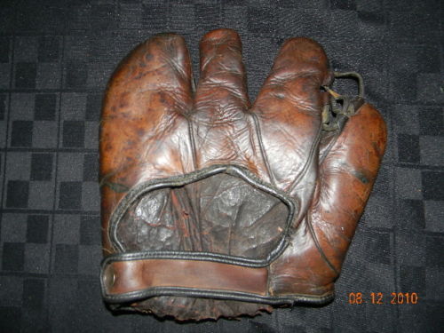This has the look of a D&M glove and could be the"Chuck Klein" model from the 1930's. The ebay listing was pretty vague. I think some D&M gloves in this era had pinky lacing and they were in grommets. The finger lacing here maybe is home-made and has gone wild! Finger stall bondage! Love the look though. Nice tunnel loop web and overall in decent shape. Went for $53 on ebay