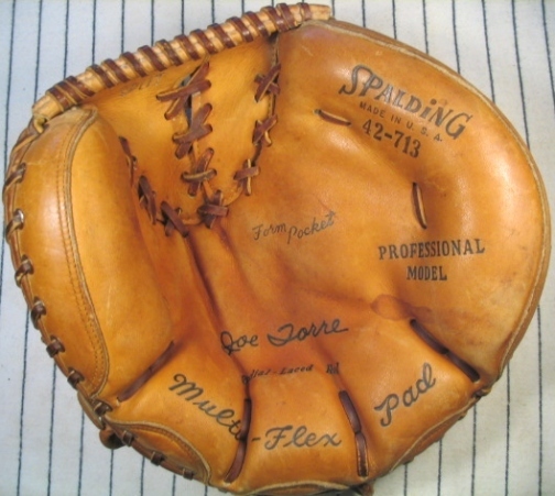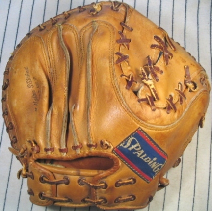 A circa 1940 Goldsmith "Joe Cronin" model glove sold for $255 on ebay. The front looks pretty standard but the back is really unique. The adjustable strap webbing is intricate, somewhat reminiscent of the "Rainey Trap" web and the leather gussets at the knuckles to add flexibility to the fingers is pretty cool looking. In the late 1930's, various patents were introduced, such as the Wilson "KurvForm" to shape the fingertips forward to create a more hollow ball catching surface. This particular glove may be related to the 1939 O'Hara patent used by some of the glove manufacturers in competition with Wilson. This is a nice glove with great markings in the pocket and overall in fine shape