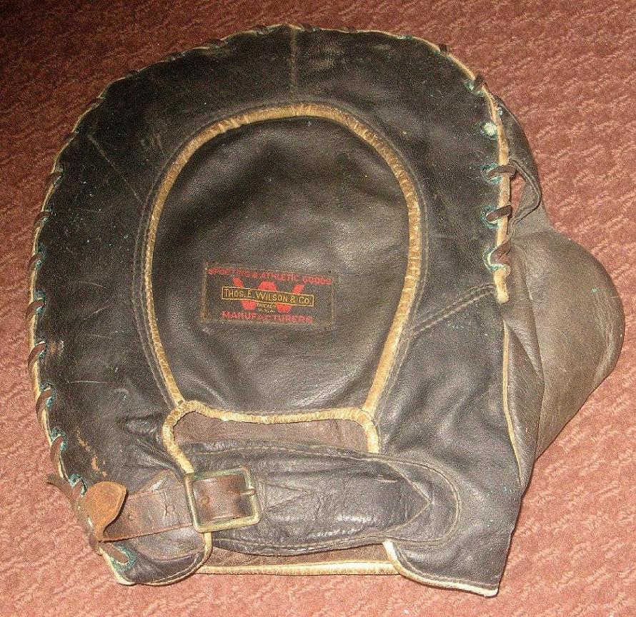 I thought this would go pretty high and it did. It's a very nice Wilson model 565 "Professional League" base mitt which sold for $331. Logo and other markings still clear on the front and a super cloth patch. Nice strap web and patented wrist strap. May be a two tone model with black front and back and brown leather thumb. The mitt has a couple of minor issues with broken lace and green junk on the brass grommets but that is relatively easy to fix. The black leather with white trim could clean up to be a stunner.