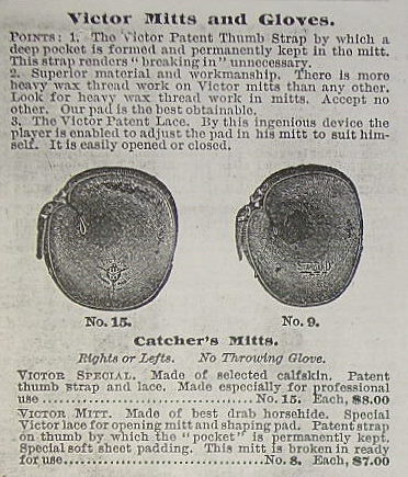 I am not saying my mitt is a Victor. There aren't any markings on it. It just has some similar characteristics. I find the Victor mitts from that period interesting for their experimentation. This image is from a 1897 Victor catalog showing the top two mitts having buckle webs.