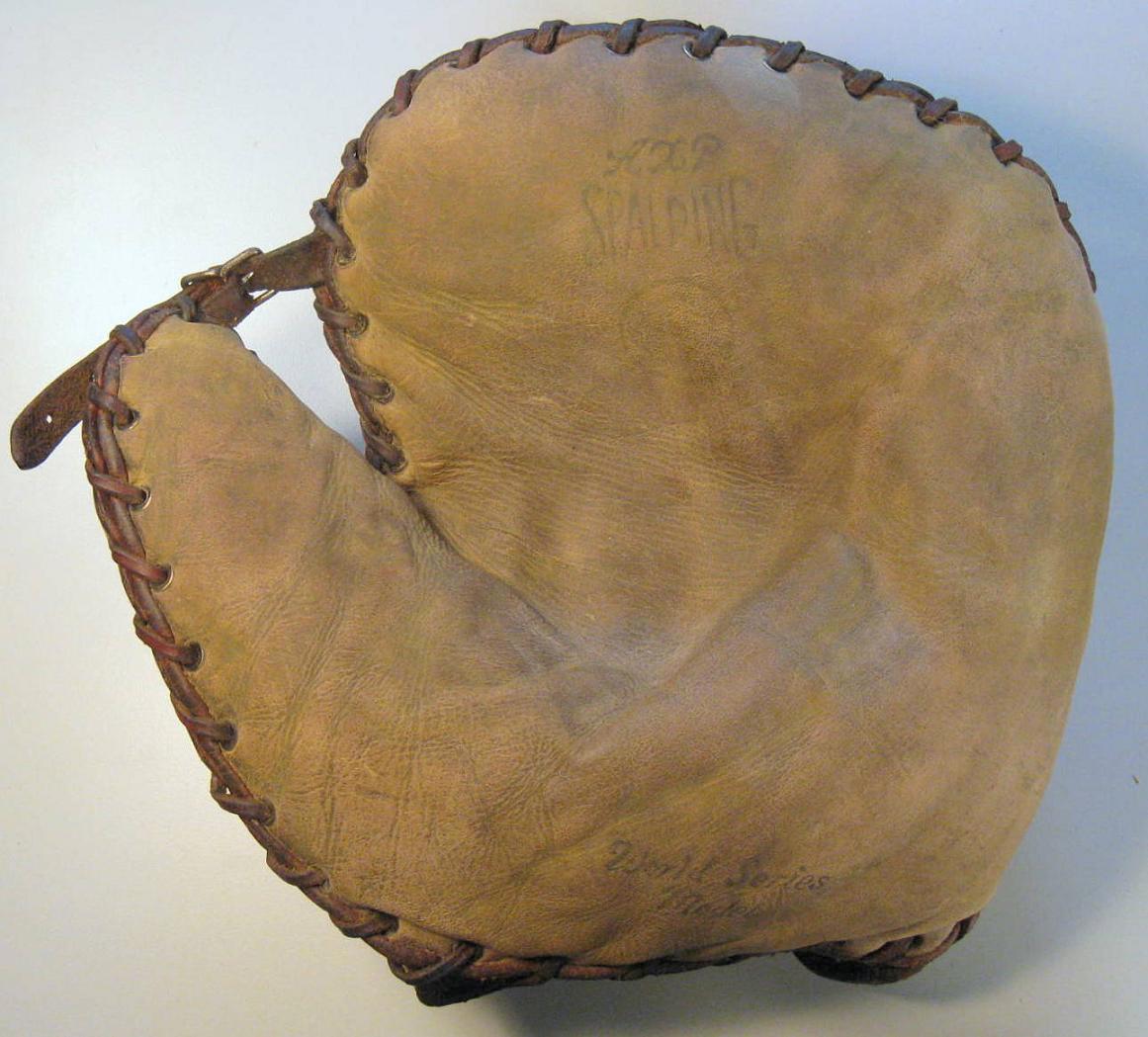 below is a 1" web Spalding glove with the King Patent lining. The lacing around the wrist is the telltale sign. This model looks like the lining was replaced at one time because of the funky relacing job with an old shoe lace. The ball player wanted to make sure the lining was secure so he double laced through some of the eyelets. Well it definitely worked.