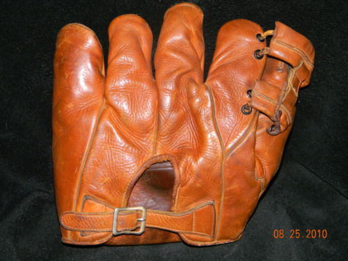 Circa 1930 Ken-Wel "George Selkirk" model for $110 on ebay. In good condition with a great cloth patch. Interesting back with the diagonal reinforcement above the wrist opening but no centered finger seams. For some reason I thought the two features showed up together.