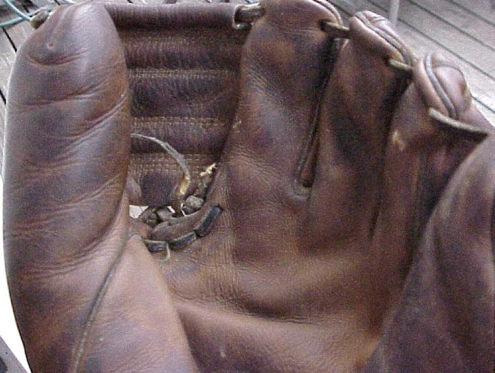 i usually bid on the gloves nobody else wants...it gives me a challenge, and i keep before and after pics with the gloves for my kids....these are my first two gloves that i have done more than change a lace...it helps having a Mohawk mother..i have worked with hides alot and skinned everything with a set of eyes....i must say...this smells better..... i have included pics of the sonnet pafko i will add pics of the sauer wilson....thanks