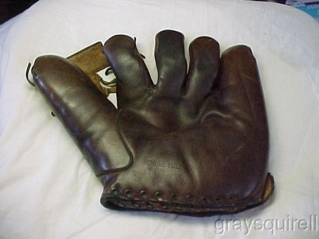 A circa 1940 Goldsmith "Joe Cronin" model glove sold for $255 on ebay. The front looks pretty standard but the back is really unique. The adjustable strap webbing is intricate, somewhat reminiscent of the "Rainey Trap" web and the leather gussets at the knuckles to add flexibility to the fingers is pretty cool looking. In the late 1930's, various patents were introduced, such as the Wilson "KurvForm" to shape the fingertips forward to create a more hollow ball catching surface. This particular glove may be related to the 1939 O'Hara patent used by some of the glove manufacturers in competition with Wilson. This is a nice glove with great markings in the pocket and overall in fine shape