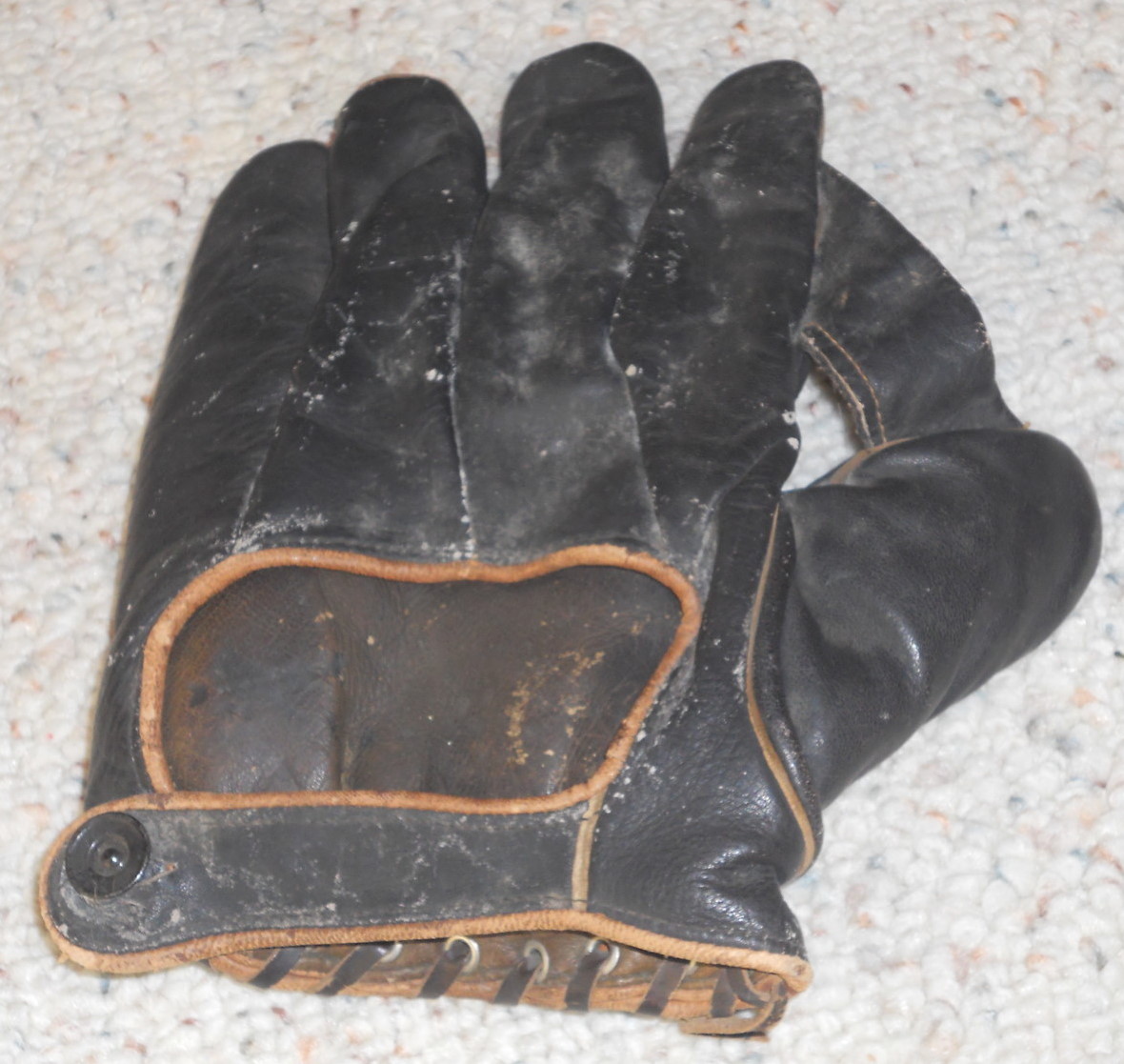 mikesglove wrote:A nice find on ebay. A black leather 1" web glove sold for $30. Looks to be a full size model with leather piping and in great shape with just a little cleaning needed. No manufacturer mentioned]