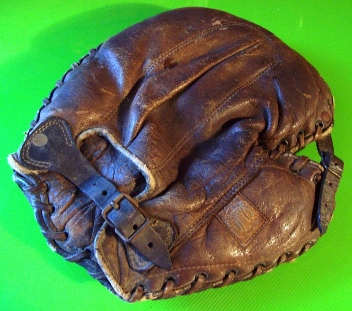 A circa 1915 Spalding catchers mitt sold for $125 on ebay. Has the characteristics of a high quality mitt. It was well used but amazingly intact and free of rips or tears. great looking cloth patch. The shoe lace perimeter lacing would need to be replaced but the black leather has a lot of clean-up potential.