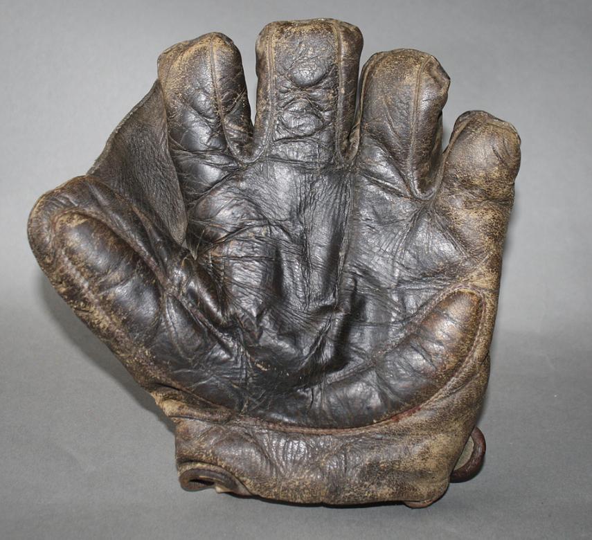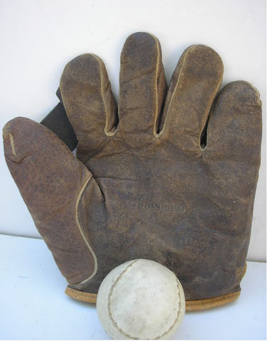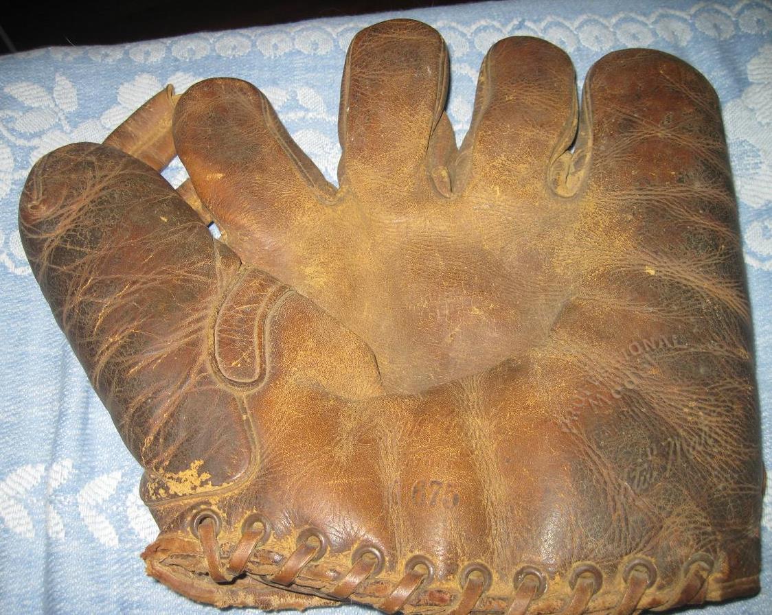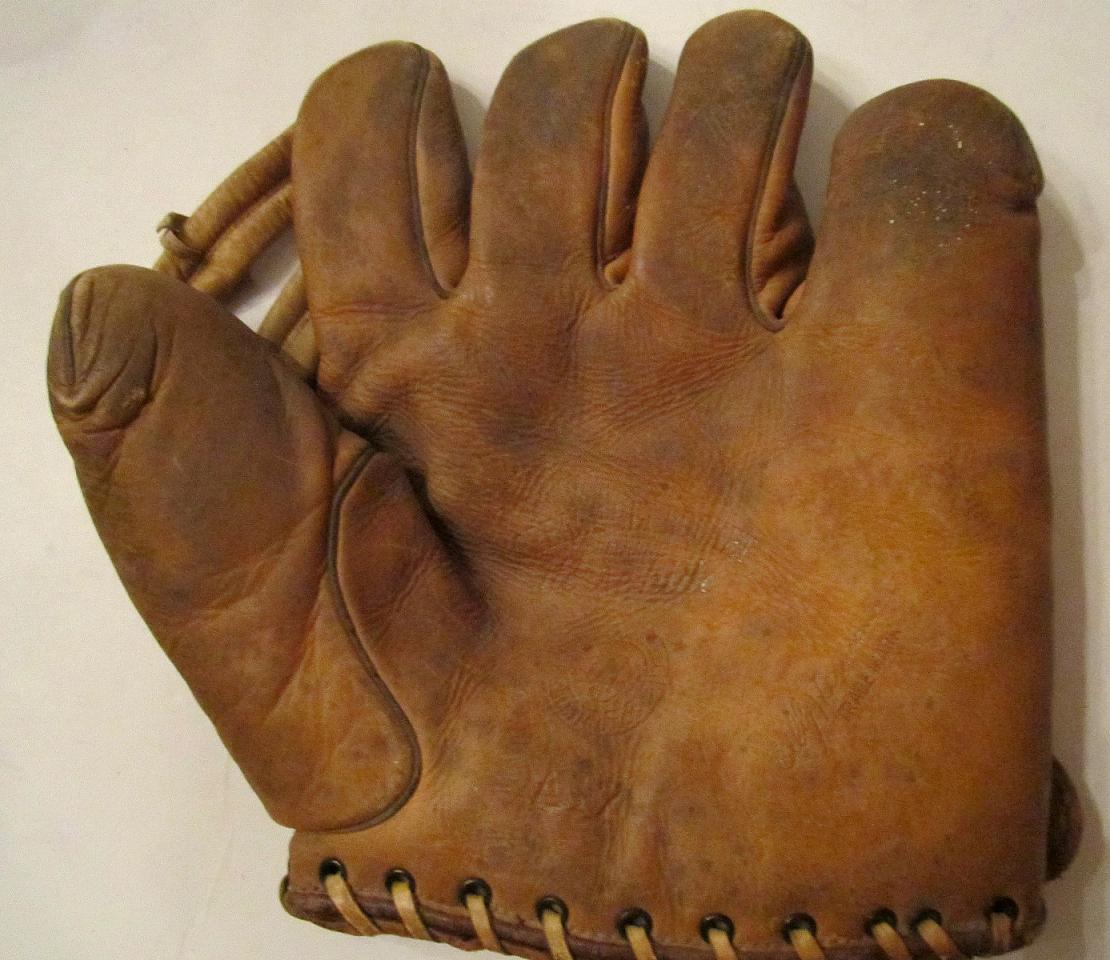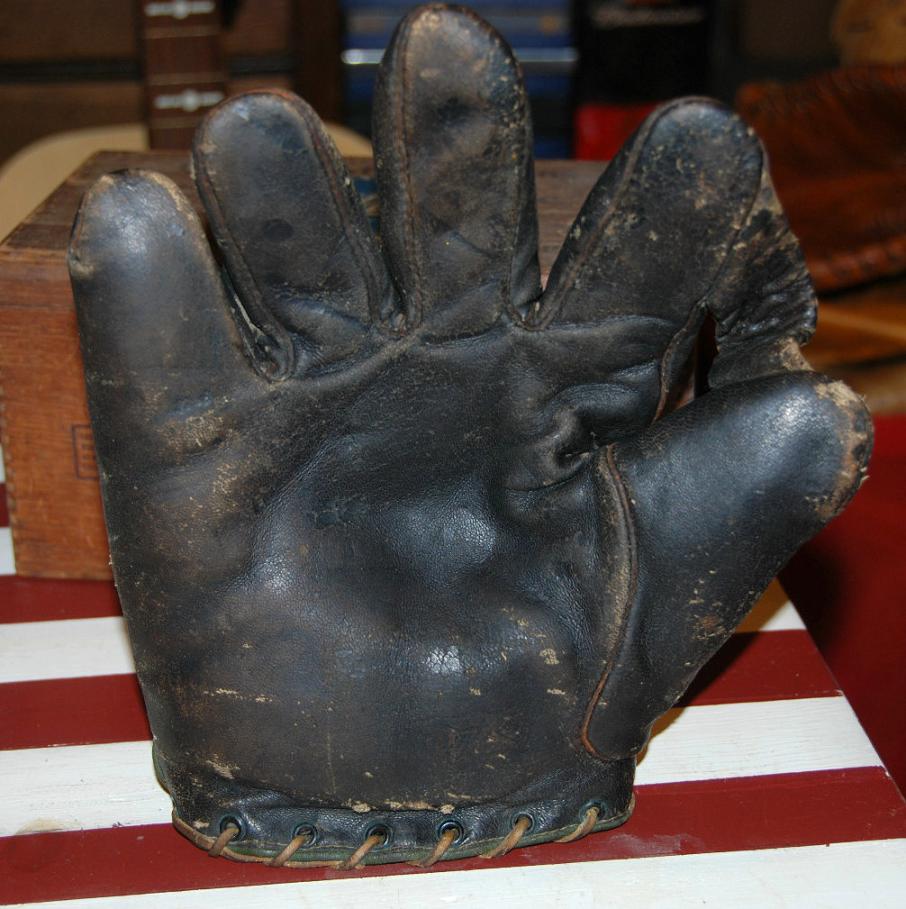 A circa 1915 Spalding catchers mitt sold for $125 on ebay. Has the characteristics of a high quality mitt. It was well used but amazingly intact and free of rips or tears. great looking cloth patch. The shoe lace perimeter lacing would need to be replaced but the black leather has a lot of clean-up potential.