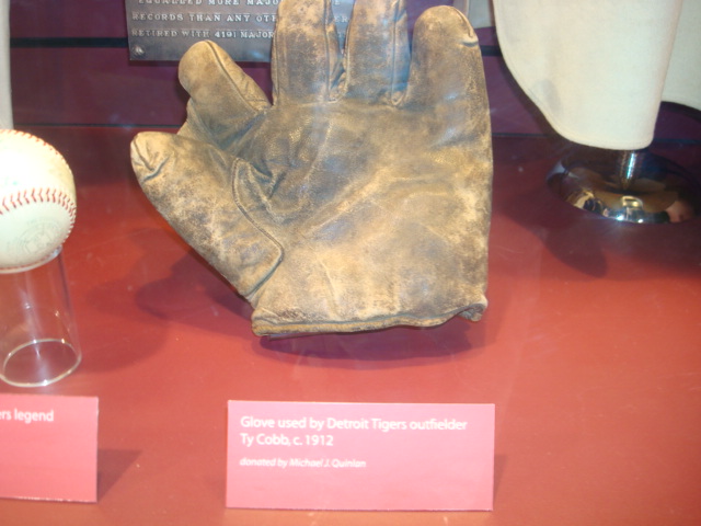 Went to All-Star FanFest last night and saw the traveling Hall of Fame Exhibit again. I never get tired of it. All-Star fever is in the air here in Anaheim. My boy Parker and I are going to the Home Run Derby and the game on Monday and Tuesday. Here are some of the gloves on Exhibit. There were game used gloves from Sisler, Cobb & Waddell to name a few. I couldn't make out the Cobb manufacturer to save my life. I swore it was a Brine, then I thought it was a Ty Cobb Sporting Goods glove. Still don't know as the stampings were so faint. Sorry for the rough pics but they were behind glass.
