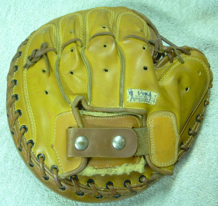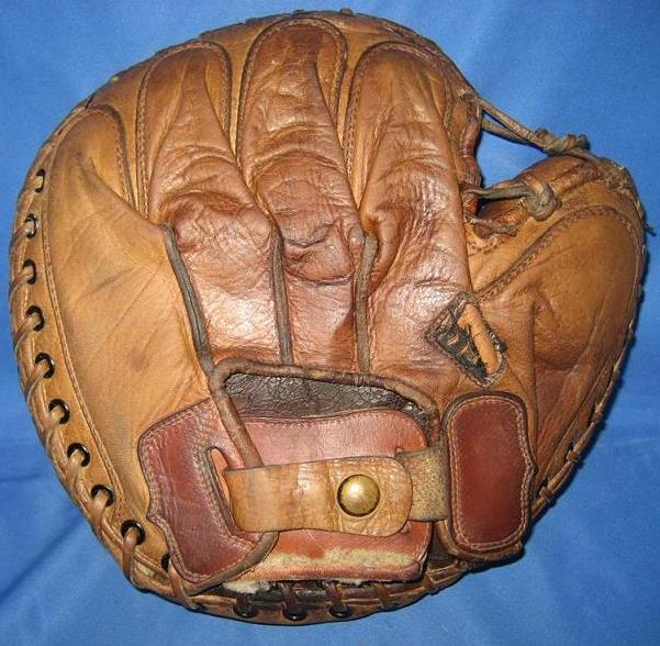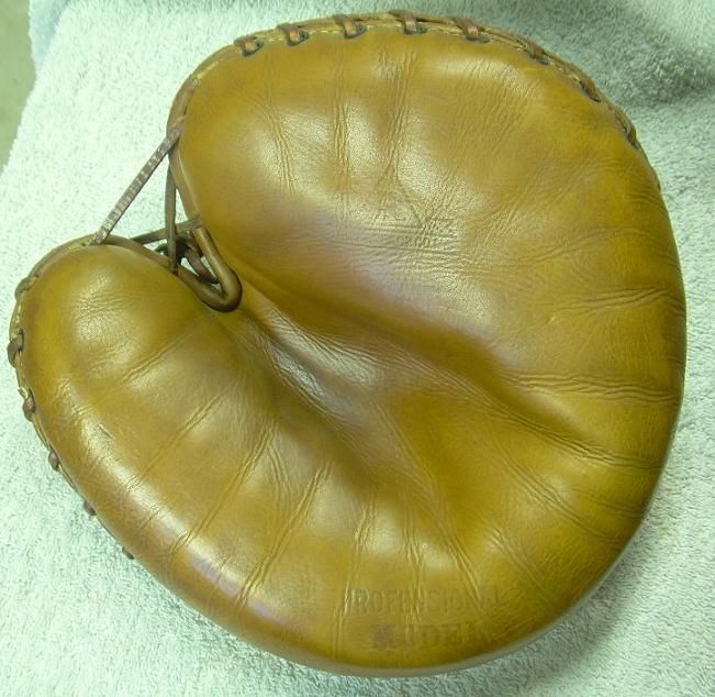 below is my updated version of the Spalding model BB. This mitt was manufactured by George Reach circa 1935-1940 and is model A8 "Professional Model". The tag on the back is from Pond Sports Shop in Appleton Wisconsin. Finger stall vent holes were added and finger cinch lacing. An extra snap was added for adjustment.