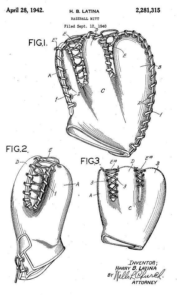 I selected the Latina "Trapper" to treat separately because there are a several different patent designs and variations. Mike Johnston's collection of "Trappers" is essential to include and there are side stories and amusing anecdotes. The story of the "Trapper" may begin with "Hammerin" Hank Greenberg, first baseman of the Detroit Tigers. In 1938 there were no rules about the type or size of a base mitt. Hank concocted a mitt that looked as big as a catchers mitt with a fishing net attached! A local scribe wrote this about the mitt. "The glove has 3 lengths of barbed wire, 4 corners, 2 side pockets, a fish net, rod and trowel, a small sled, a library of classics, a compact anti-aircraft gun, a change of clothes and a pocket comb." Pretty funny stuff! By 1939, rules were put in place by MLB limiting the sizes of gloves and mitts and thus ended Hank's experiment. It was a fortuitous time for Harry Latina and why he was so highly regarded as an inventor because by 1941 He revolutionized the basemitt with his "Trapper" design, replacing the older "Oven Mitt" style