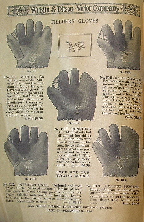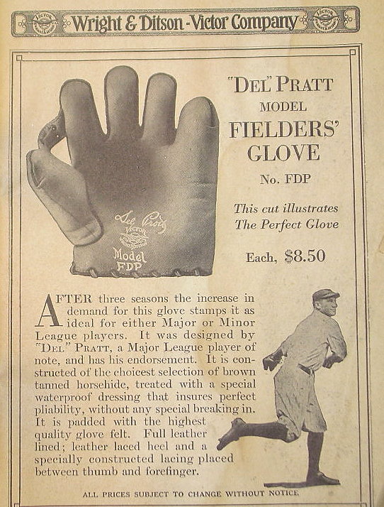 Their top of the line glove in the catalog was the "Del Pratt" model FDP and is distinguished by an adjustable web. I looked through the VWD section of http://www.baseballglovecollector.com and found this unidentified model. Dave may be happy to know his glove may be the Pratt model.