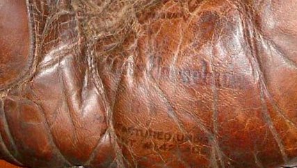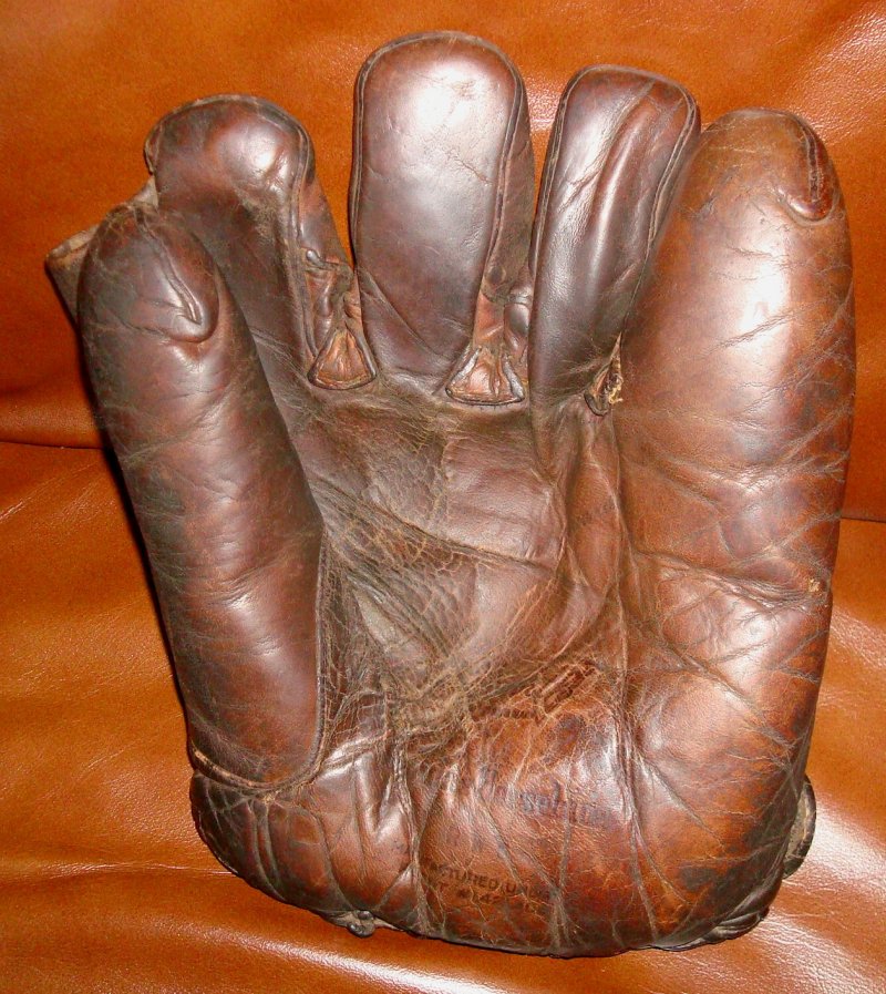 There is an interesting patented feature of the Wamby 1920 gamer glove that is also present on the Worth store model glove endorsed by "Bill Wambsganss" that came from the collection of Art Kapsapsis. At the heel of Art's glove is stamped "Licensed under Pat. # 1421308. That patent by Ruben Raymond in 1922 refers to the tabs of leather poking out at the crotch of each finger acting as a reinforcement from wear and tear. You can see it pretty clearly on the front of Art's glove below. Picture from http://www.baseballglovecollector.com