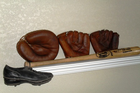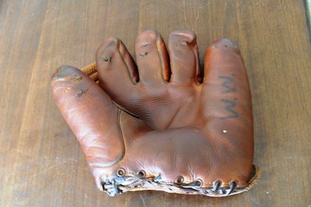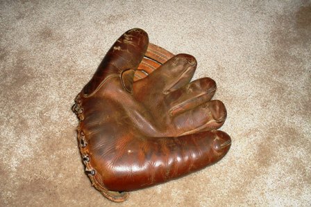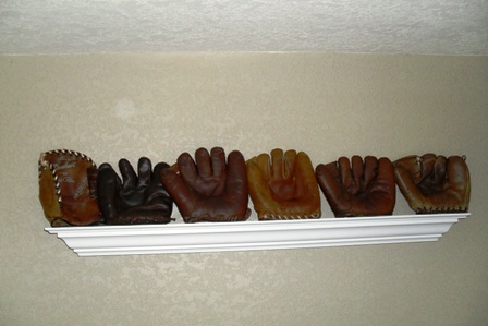 Late last night decided to do some cleaning on some gloves that I have found and thanks to the info on this forum all is well. The one I didn't really see any markings on was this Nokona glove. After cleaning I could faintly see what looked like Professional Model on the pinky. When I was rubbing in some vpj I notice a G that was pretty good and a 9 the 4 was real faint. Decided to do some research and thanks to Jim Daniel's collection "Baseball Glove Colletor" I was able to trace down what I had. Here is the before and after pictures and the final display. I know this isn't the best glove it almost looks like a dog got a hold of it and the dreaded black intials. :D