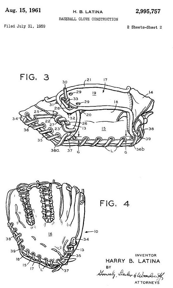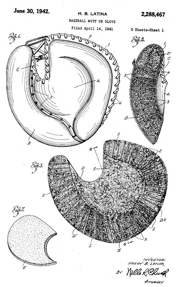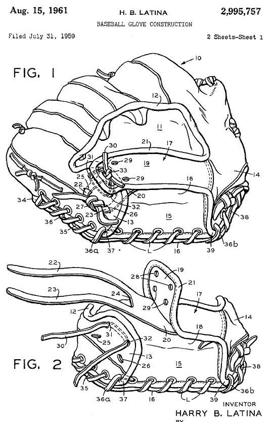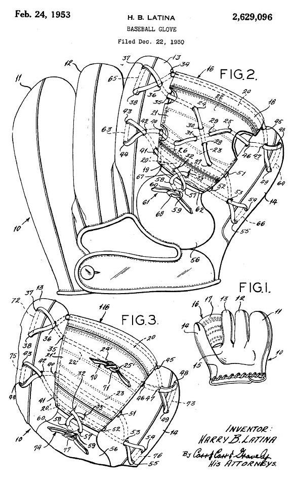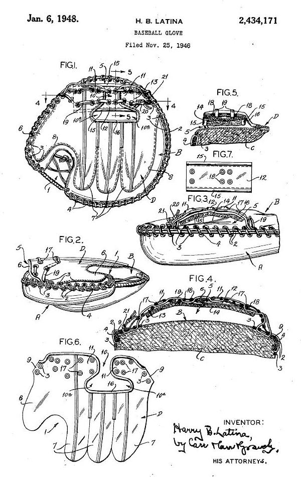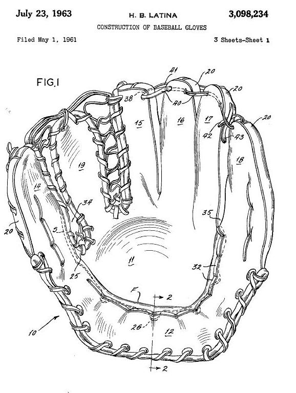 Two 1948 patents issued at the same time dealt with the web attachment and wrist strap of catchers mitts. Previous to the first patent below, the perimeter lacing of catchers mitts extended into the crotch between the thumb and body of the mitt. The crowding of lacing and grommets in this area decreased flexibility and increased the wear and tear of both grommets and lacing. The Latina patent used overlapping leather tabs sewn into the crotch to eliminate the perimeter lacing in that area incresing flexibility and strengthening the metal grommets used to attach the web