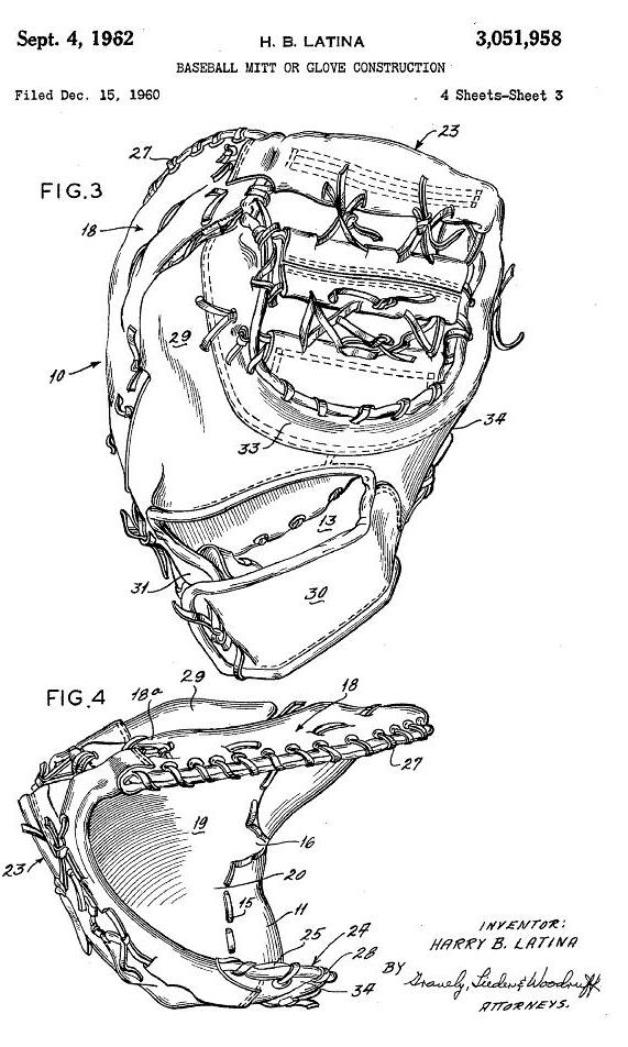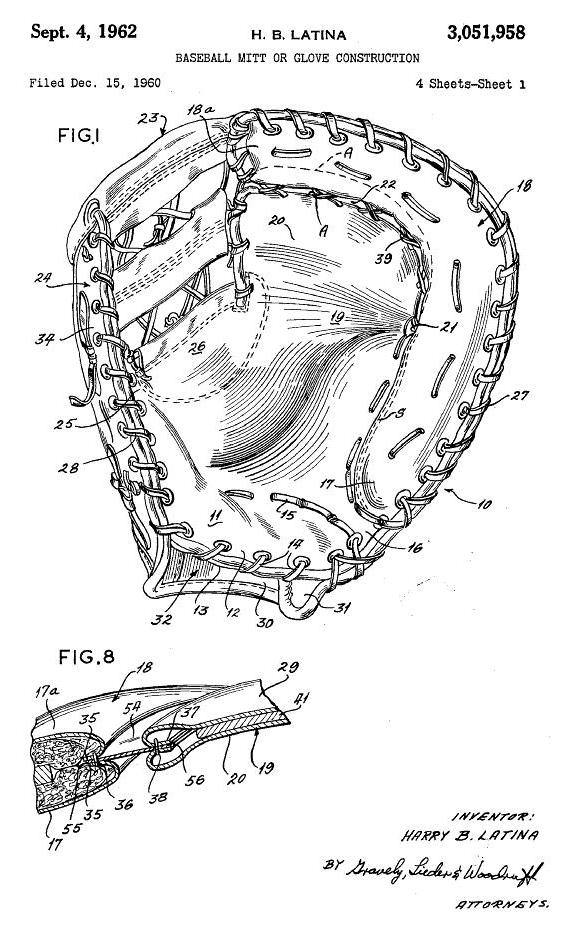 As you can see, webbing of the gloves and mitts was an important consideration for the Latinas. Some of the Latina web patents were designed to be used on both gloves and mitts as this 1962 patent states