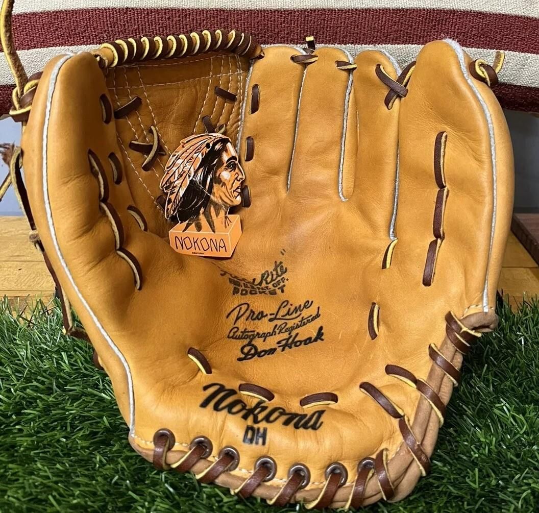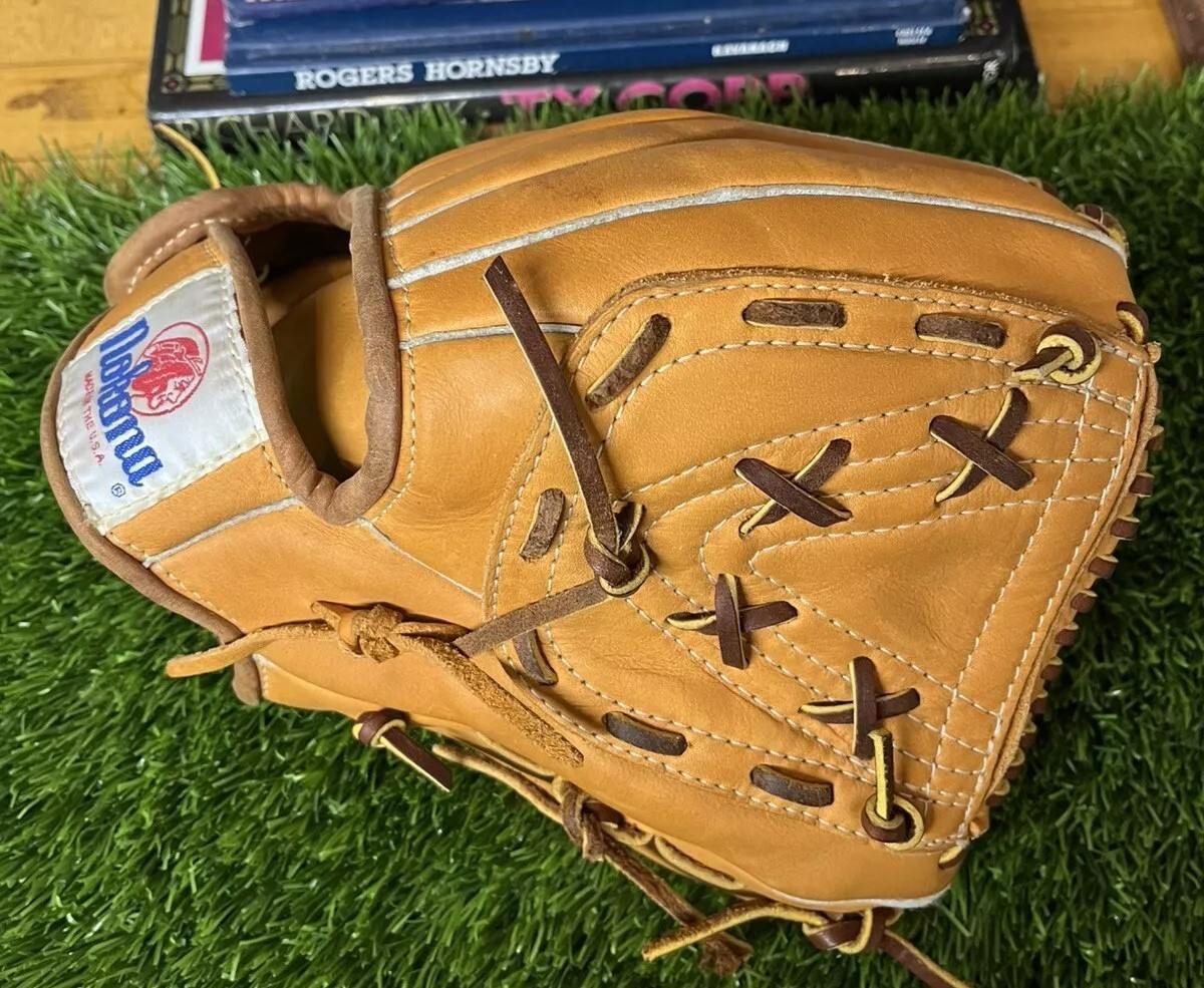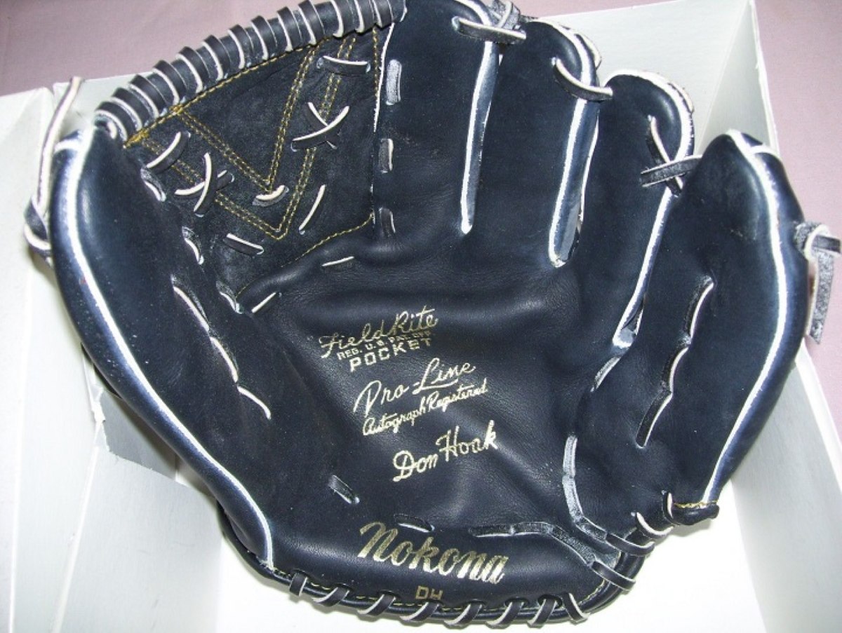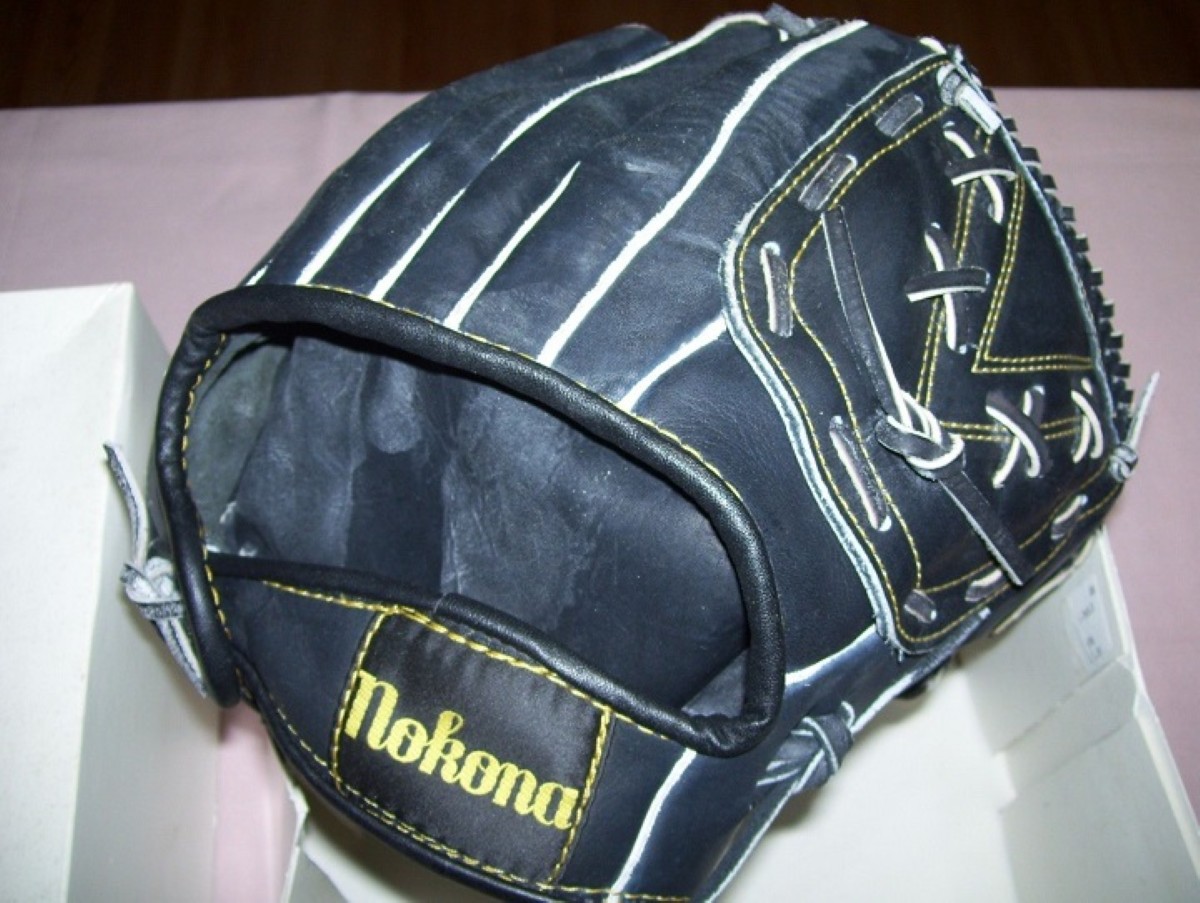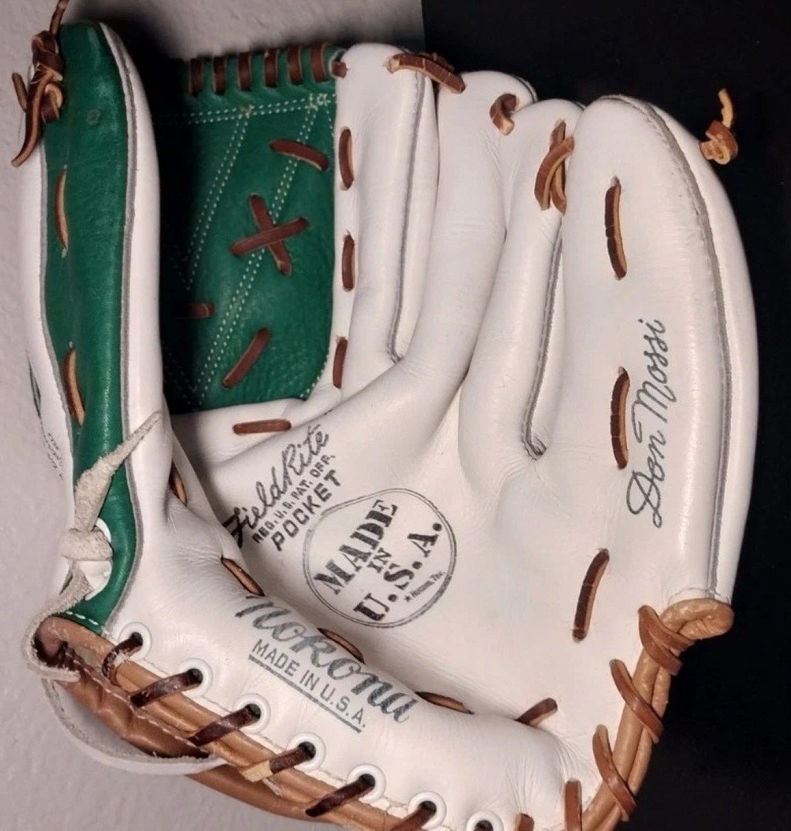 A reissue Nokona Don Mossi model F160 glove in white & green dyed leather. Just super looking. Given as an award for a baseball camp participant.