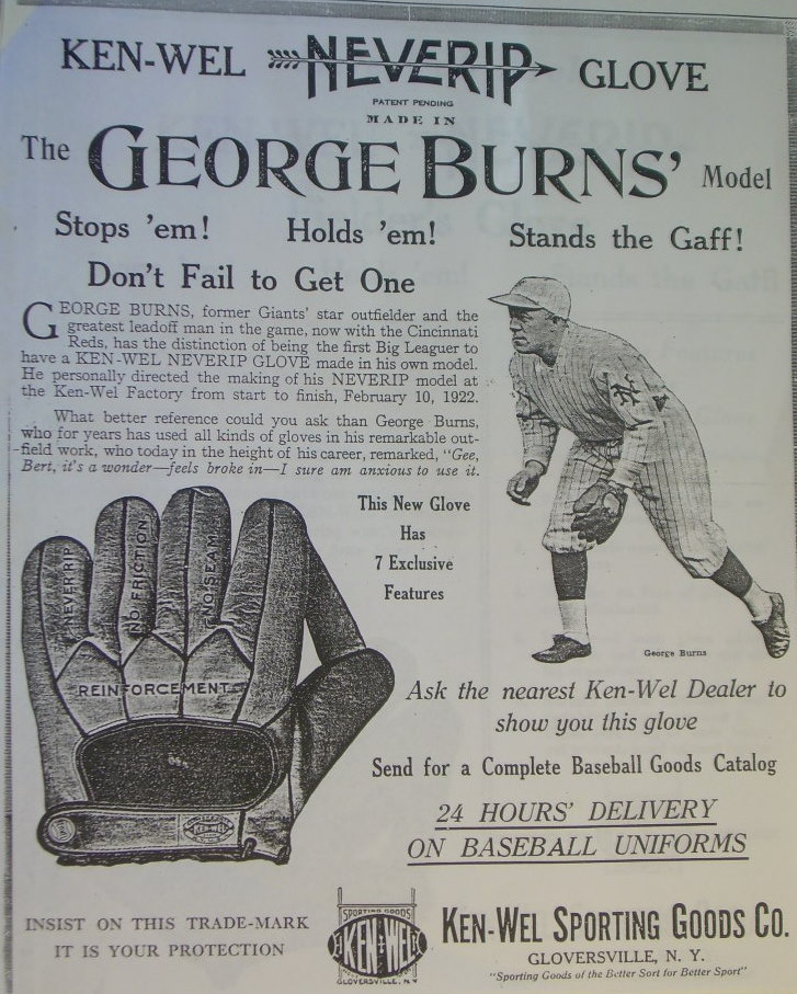 I found some old ads for KenWel gloves from 1922-1924 and one states that 150 National and American League players use and endorse KenWel gloves and mitts. Giants outfielder George Burns was the first to endorse his own KenWel model circa 1922. In 1923, KenWel went on a big advertising campaign featuring Bill Kamm, George Burns, Sammy Bohne, Eddie Rousch and Babe Pinnelli. Dazzy Vance was KenWel's big star endorser and the ad for his glove states mailing in a coupon would result in a letter from Vance and a KenWel catalog.