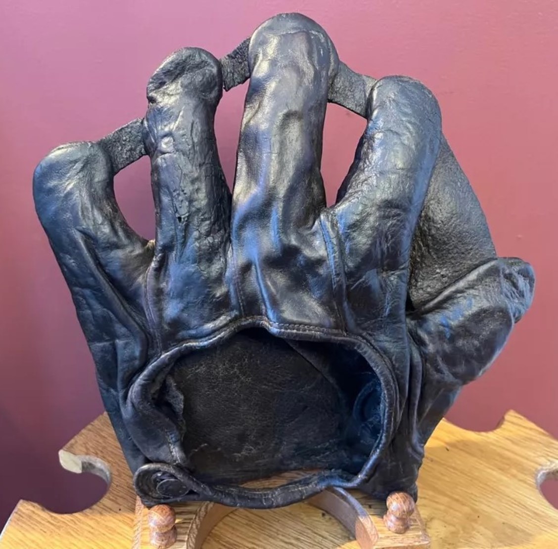 The mitt is pretty early and features the 1908 patented web lacing which was meant to be an improvement of the D&M grommeted web of 1889. The mitt looks to be a lower line model which has some flaking of the leather on the face.