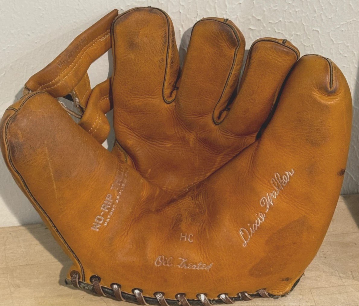A nice Goldsmith Dixie Walker glove from ebay. For a while, I thought the "No-Rip" patent stamp on the thumb was for the one piece face. Not so however. The patent was for the flap of leather covering the space between the thumb and first finger stall. It was a place a lot of gloves eventually ripped open. You can see the flap from the backside of the glove.
