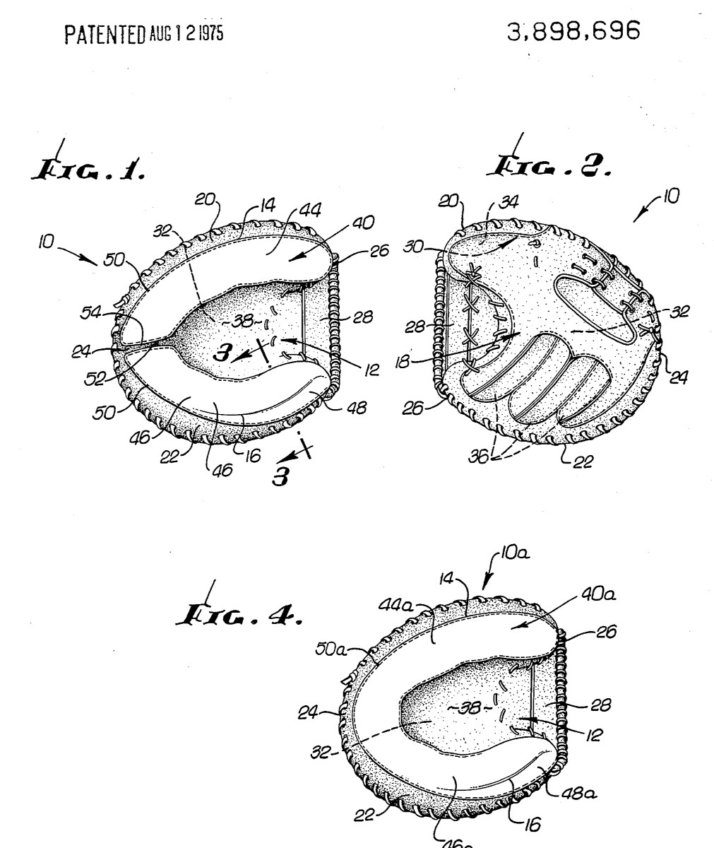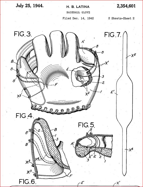 The Rawlings Latina patent of 1944 had three functions. First as thumb and finger loops, second as a means of stabilizing the thumb and little finger padding from migrating to the center of the glove and third as a means of holding the thumb and little finger in an inwardly twisted and downwardly deflected position.