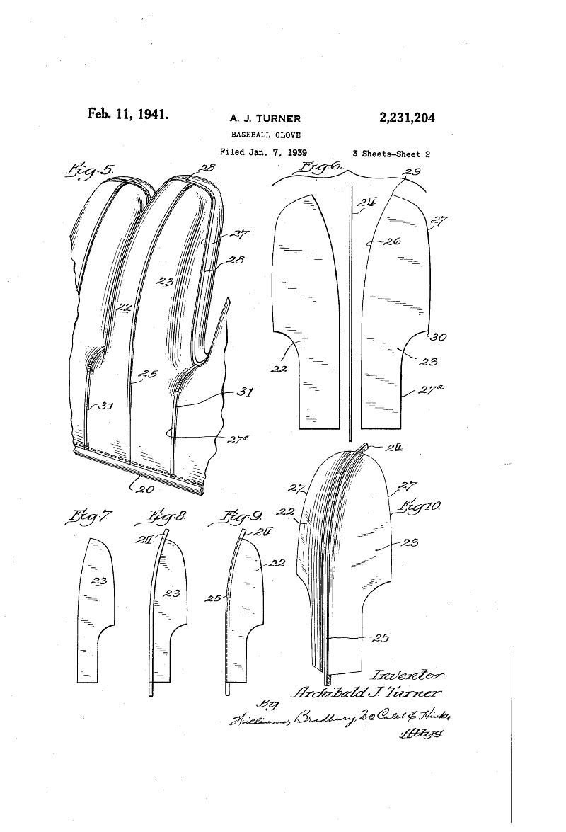 A ruling in 1956 from the U.S. Court of Appeals settled a lawsuit between Archibald Turner, inventor for Wilson Sporting Goods, and the inventor H.J. O'hara. At issue was the patent for the design and construction of a natural curve back on a baseball glove. O'hara's patent of 1938 is shown below. The curve of the fingers was created by transverse seams of the finger stalls.