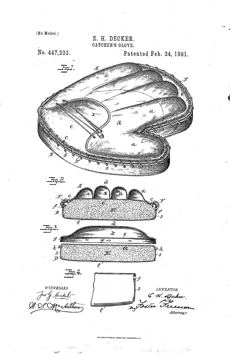 The fatal flaw in the Kennedy design was the patent was only for the wire reinforcement, not the mitt itself. Harry Decker, catcher for the Chicago team sensed Kennedy's mistake and immediately patented his version without the wire. Harry Decker's invention was called the "Decker Safety Mitt" and featured a heavily padded front with a thick leather back and seam along the top edge. Joe Gunson had also eliminated the wire reinforcement in his mitt long before and grudgingly recognized the Decker mitt as the better design