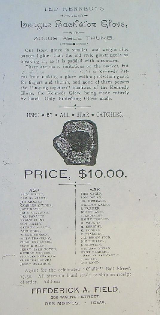 The "Kennedy Patented Mitt" was featured in a circa 1892 Frederick A. Field Co. advertisement for a whopping $10. A lot of money at the time. The construction of the mitt was intricate and time consuming. The ad boasts of the Kennedy mitt Being the only glove made with a fingers and thumb protection guard