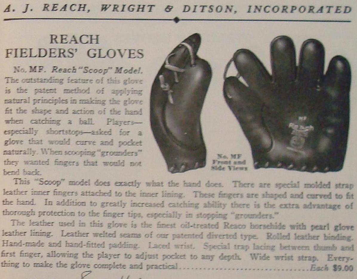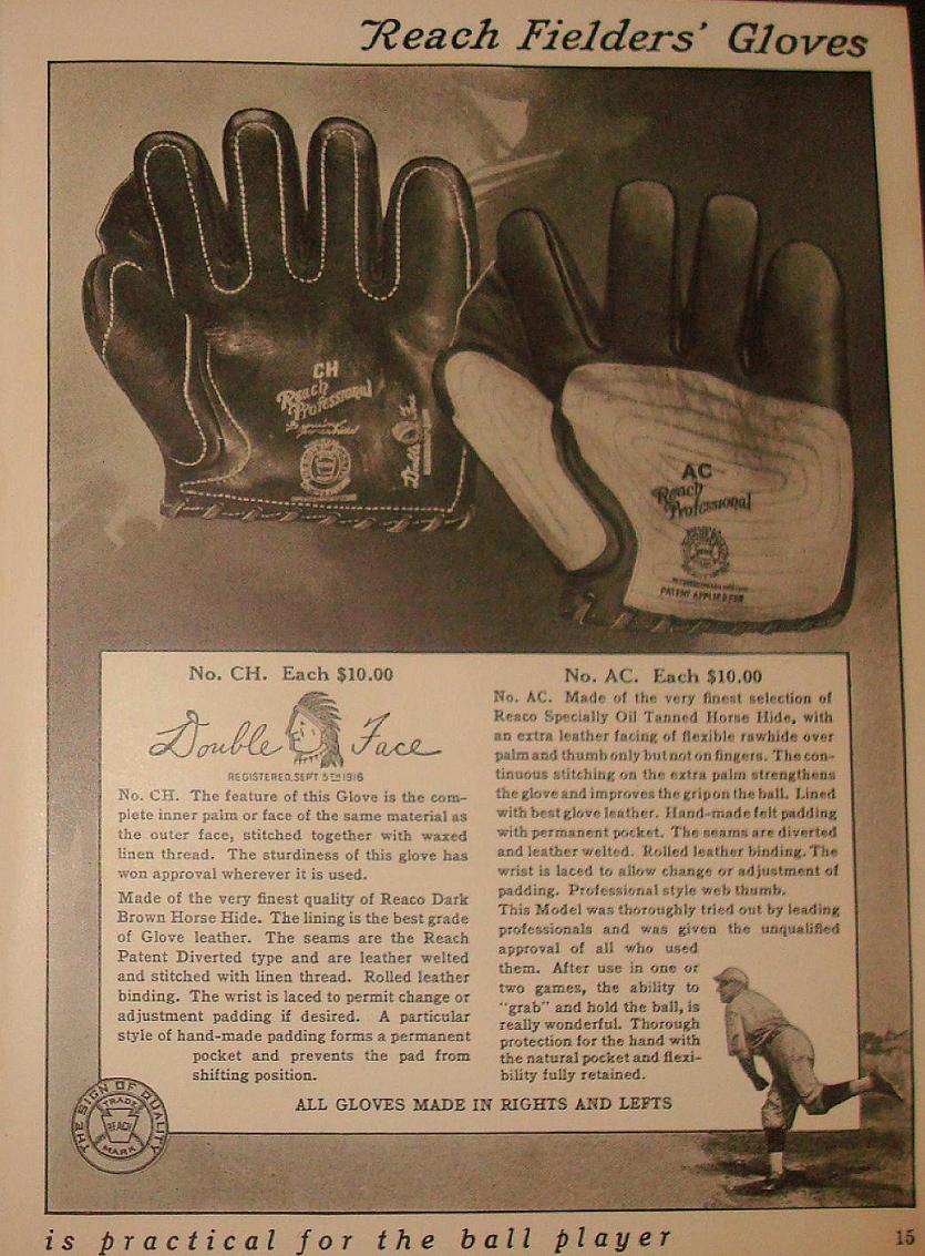 The 1925 Reach catalog features the model AC "tornado palm" glove along with the model CH "Double Face" model, both $10 at the time and featured gloves in the catalog.