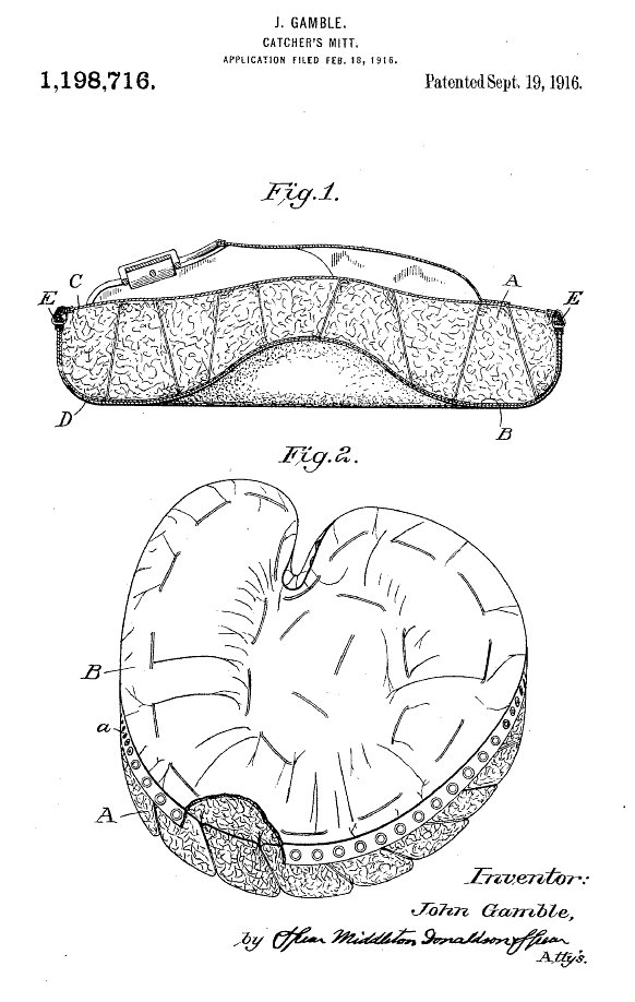 The "Double Face" design was a 1916 invention by John Gamble for George Reach and featured an inner layer of leather stitched to the padding and functioning as a reinforcement to the outer face of the mitt and as an aid to keep the structural integrity of the padding in place.