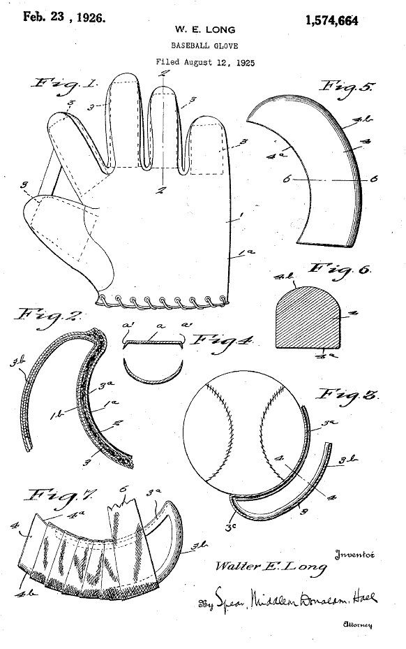 By 1926 George Reach was turning his attention to a more curved finger glove to capture a ball efficiently. Mr.Mitt posted the stiffness of the extra padding in the "Fielders Choice" glove could have doomed it. This patent by Walter Long in 1926 for George Reach is for a curved finger glove and is interesting as a precursor to the various Kurv-Form gloves circa 1940. An extra curved leather piece was attached inside each finger stall. As a ball struck the pocket, the curved fingers would be drawn over the ball, containing it.