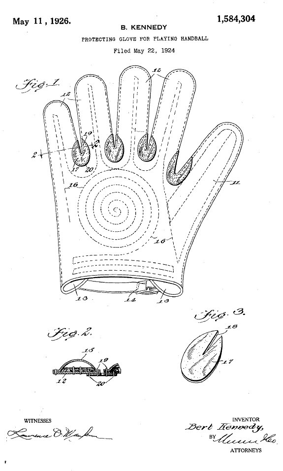 Here is a beautiful looking Kenwel handball glove presently on ebay. There are a lot of similarities in the palm stitching of this glove with the Spalding "Fielders Choice". The Kenwel glove was patented a little later in 1926 by Burt Kennedy. Notice the patented "bifurcated patch" as a finger crotch reinforcement. It is an interesting variation of the 1912 J.A. Peach invention for a wrist opening reinforcement. This is such a stellar example that if I was a KenWel collector this glove would be gone! It has the older cloth patch and is pristine. Nice out-seam construction and stamping of the patent on the thumb.