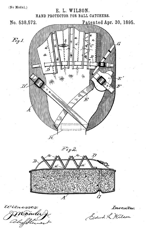 This invention by Edmond Wilson in 1895 sought to eliminate the hand being enclosed in the manner of the standard catching mitts of the day. He stated that since baseball was a summertime sport the build up of moisture and sweat on the hand would decrease the usefulness and playability of the leather and cause the player great discomfort. To improve the usefulness and efficiency of the catchers mitt, Wilson designed a mitt with leather retainers and straps to replace normal finger stalls. This would allow the fingers to stay open to the air.