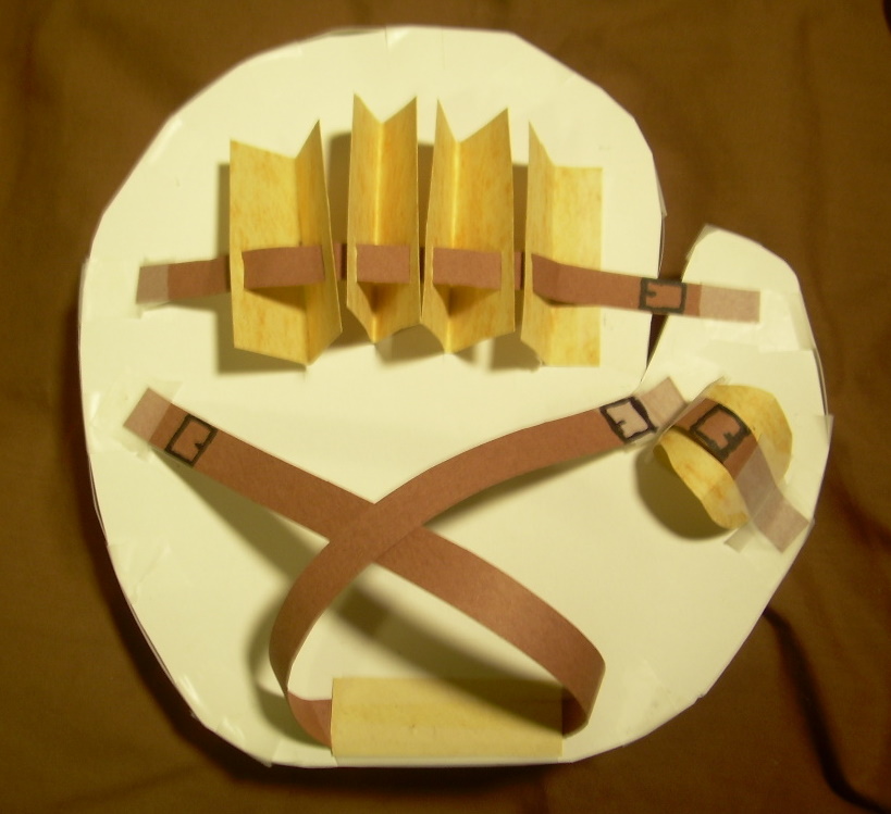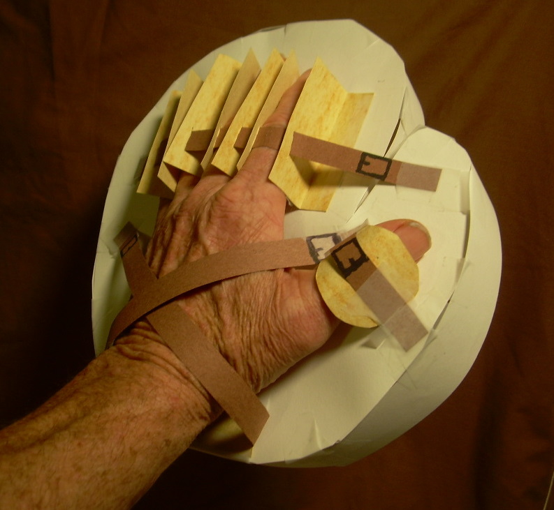 I had to study this patent drawing quite a while to understand the construction. I thought it might be fun to make a mock-up of the mitt. The wedge shape yellow pieces are the "retainers" mentioned in the patent with the various brown buckle straps to hold the hand in place.