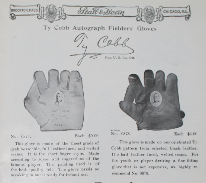 I saw this in a 1921 Stall & Dean catalog and thought it was interesting. There are photos superimposed on the palms of the gloves. Now, I know they didn't actually do this but it got me thinking about it a bit. Would this have been possible in this era (William and Mike, I'm looking in your direction)? Would it have been popular? Can you imagine the collect-ability of them in this era. A Ty Cobb glove with his photo in the palm? We know decal bats do well - I think the gloves would be even cooler! Thoughts?