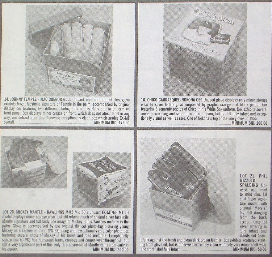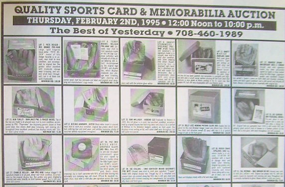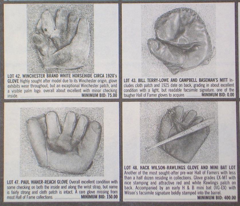 This 1995 catalog from "The Best of Yesterday" auction in Illinois may have been the first blockbuster vintage baseball glove auction. Dave Bushing may have put this on. It is chock full of great gloves, some of which are recognizable in the recent Legendary auction. This auction was notable for the dozens of boxed gloves and the Gehrig zipper back mitt.