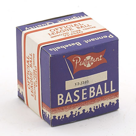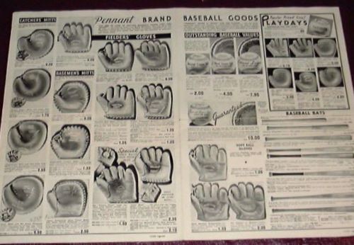 "This is a used 4 page brochure published by Pennant Brand. I do not know the age of this brochure but it is from the 1940's based on the autographed mitts from Bill Dickey, Dolph Camilli, Augie Galan, Billy Herman, Gabby Hartnett, Hank O'Dea, Eddie Marshall, etc. This brochurs contains photos, illustrations and prices of sporting goods. Some of the items are: baseball bats, softball gloves, baseballs, soft balls, uniforms, baseball shoes, tennis rackets, tennis balls, Stevens Bolt Action .22 Rifles, golf balls, catchers' mitts, basemen's mitts, fielders' gloves and more."